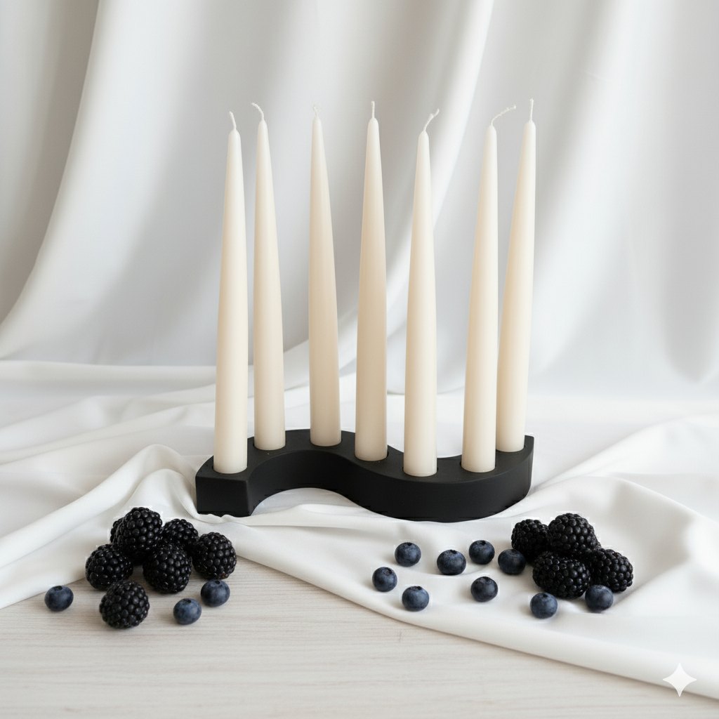 Novanilla K18B ir svečturis, kas radīts, lai telpā iedzīvinātu klusu un silti pulsējošu gaismas līniju. Tas ir pašdarināts melns ģipša svečturis, kura garenā forma un atturīgā matētā virsma rada stabilu, vizuāli koncentrētu akcentu interjerā. Šis svečturis ir veidots septiņām stearīna svecēm, kas, degot vienlaikus vai pa vienai, piešķir telpai gan gaismas ritmu, gan noskaņas daudzslāņainību. Melns svečturis veido dziļu kontrastu ar liesmu, un tādēļ siltums kļūst uzskatāms ne tikai kā gaisma, bet arī kā sajūta.